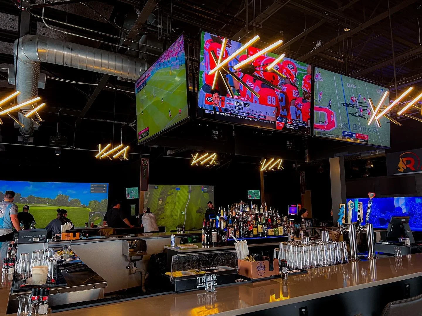 Much attention was given to the bar design to serve the most amount of patrons. Even more, Par28’s signature coal-fired pizza oven needed to be featured and viewable from multiple angles. Their distinctive shark tank required a showcasing area, and the six 75-inch TVs necessitated proper placement above the bar. Adding in the axe and golf areas, programming demanded extra consideration for power sources, exterior exhaust, and plumbing, and patron flow - all while making sure spaces were safe for patrons. The challenge to accommodate areas for large group gaming and smaller intimate social spaces was achieved.