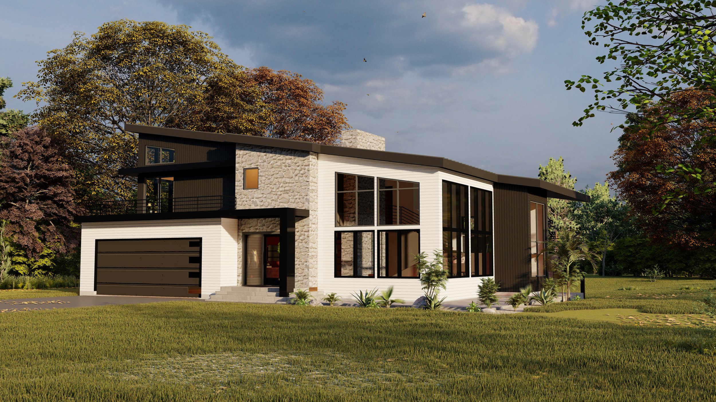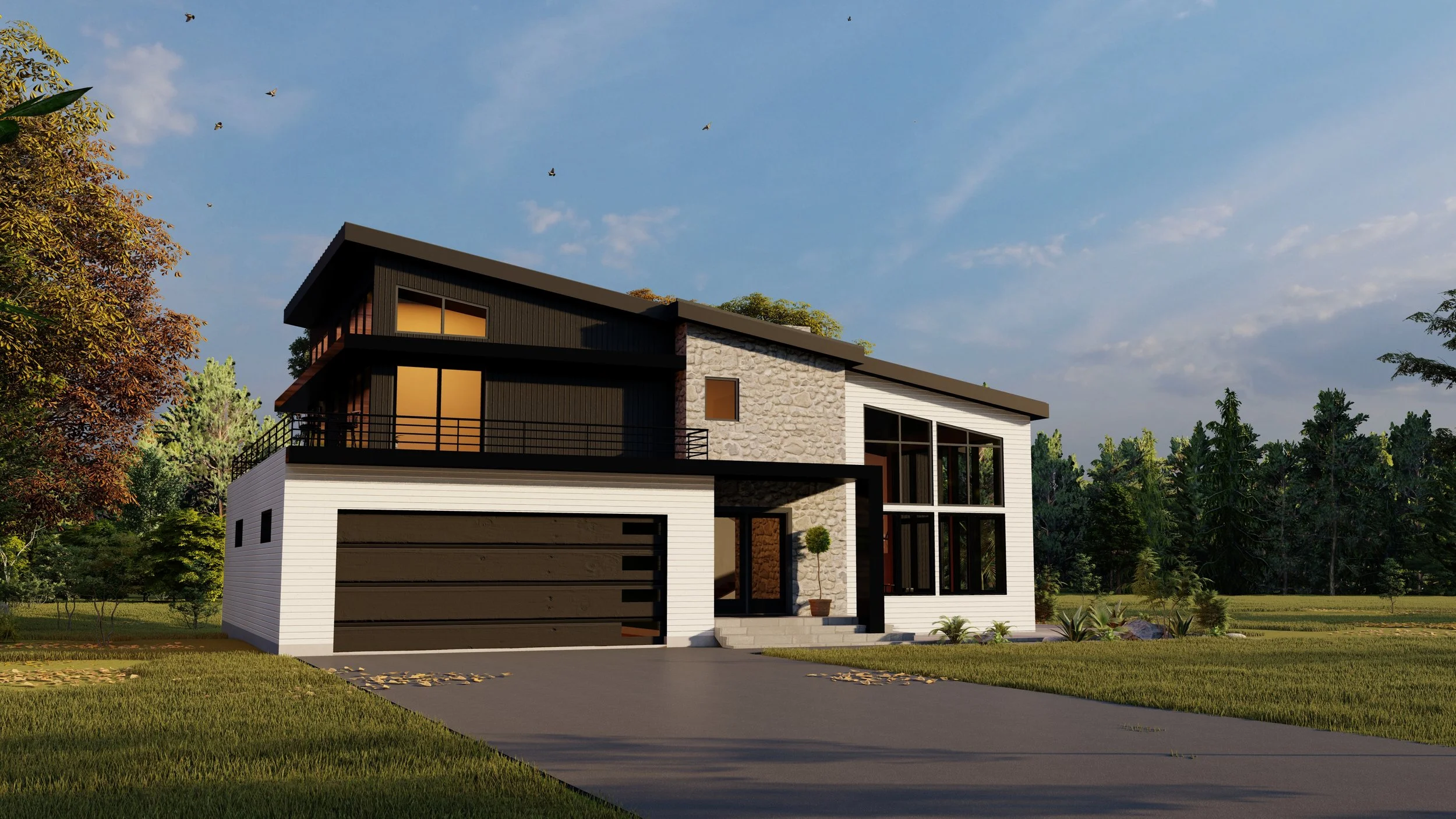 The home features a dramatic asymmetrical roofline and a refined mix of materials — warm brick, vertical and horizontal siding, and sleek black accents — creating a dynamic visual profile from every angle. Inside, an open-concept layout floods the home with natural light. Large, strategically placed windows allow daylight to cascade through all levels, while providing sweeping views of the property’s natural setting.